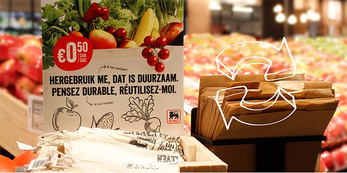 Onze klanten gebruikten jaarlijks 80 miljoen plastic zakjes om hun groenten en fruit te vervoeren. Maar sinds 2018 is dat voorbij! We hebben ze vervangen door papier en nu zijn er ook herbruikbare zakjes. Deze zijn verkrijgbaar in de rayon fruit en groente. Een eenvoudige oplossing die een groot verschil maakt. Resultaat? 1600 ton plastic minder per jaar.