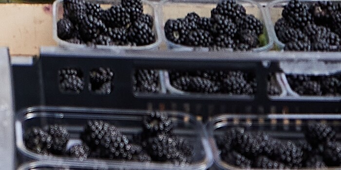 Fruit dat geoogst wordt, gaat naar de koelcel om daarna verpakt te worden. We doen een laatste kwaliteitscontrole (bijv. op gewicht) en plakken etiketten op de verpakkingen. Van hieruit vertrekken de braambessen rechtstreeks naar het distributiecentrum van Delhaize.