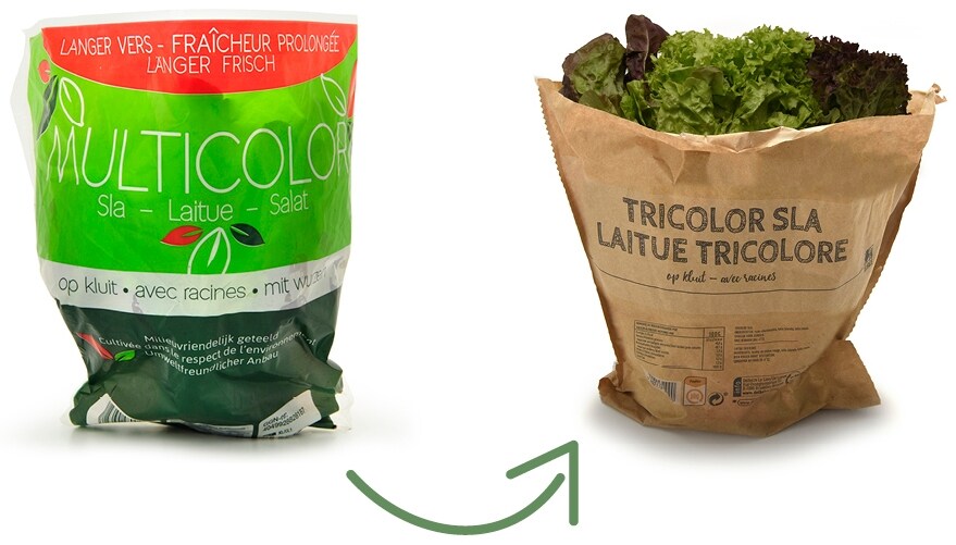 Nos salades fraîches sont en effet vendues dans un emballage plus respectueux de l’environnement ! Auparavant, vous les trouviez dans un emballage en plastique. Et quand on sait qu’1.000.000 de sachets sont vendus chaque année… ça fait 1.000.000 de sachets en plastique de trop. Heureusement, elles sont désormais emballées dans du papier ! C’est non seulement plus écologique, mais la salade se conserve également plus longtemps car elle respire mieux à travers le papier qu’à travers le plastique.