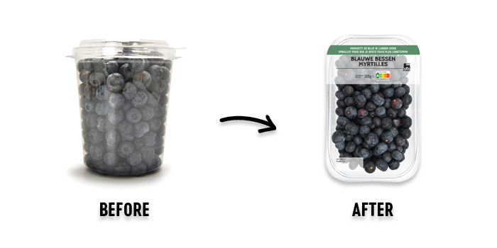 Toch beslisten we bij Delhaize om de verpakking van onze blauwe bessen te herzien. Het doel? De impact op het milieu verminderen en afval beperken. De stevige plastic pot met deksel waarin de besjes zaten, werd dan ook vervangen door een fijner bakje, afgesloten met een dunne plastic folie. Het is een kleine, discrete aanpassing die enorm veel doet voor de toekomst van onze planeet.