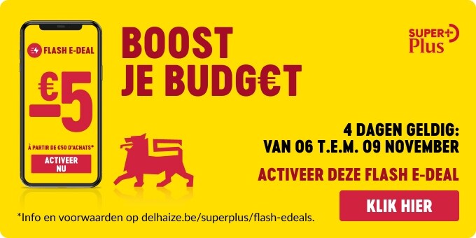 De korting is geldig bij een aankoop van min. €50 van donderdag 06/11 t.e.m. zondag 09/11/2025 in alle deelnemende Delhaize-winkels, of bij een reservatie van min. €50 van donderdag 06/11 t.e.m. zondag 09/11/2025 via de website delhaize.be. De korting gaat verloren bij wijziging van de online reservatie na 09/11/2025. Zijn niet inbegrepen in de berekening van het winkelmandje: gemeentelijke vuilniszakken of -stickers, producten van de Nationale Loterij of producten van bpost, 365 producten, producten voor de snelle verkoop, geschenkbonnen, prepaidkaarten voor gsm, rookwaren, leeggoed, promoties, online only-promoties, voorbereidings- of leveringskosten, personeelskortingen of andere diensten Maximum één Flash e-Deal korting per SuperPlus-klant gedurende de looptijd van de actie. Deze aanbieding is niet cumuleerbaar met andere aanbiedingen, noch inwisselbaar, noch terug betaalbaar. Zie voorwaarden van het SuperPlus-programma op www.delhaize.be/superplus.